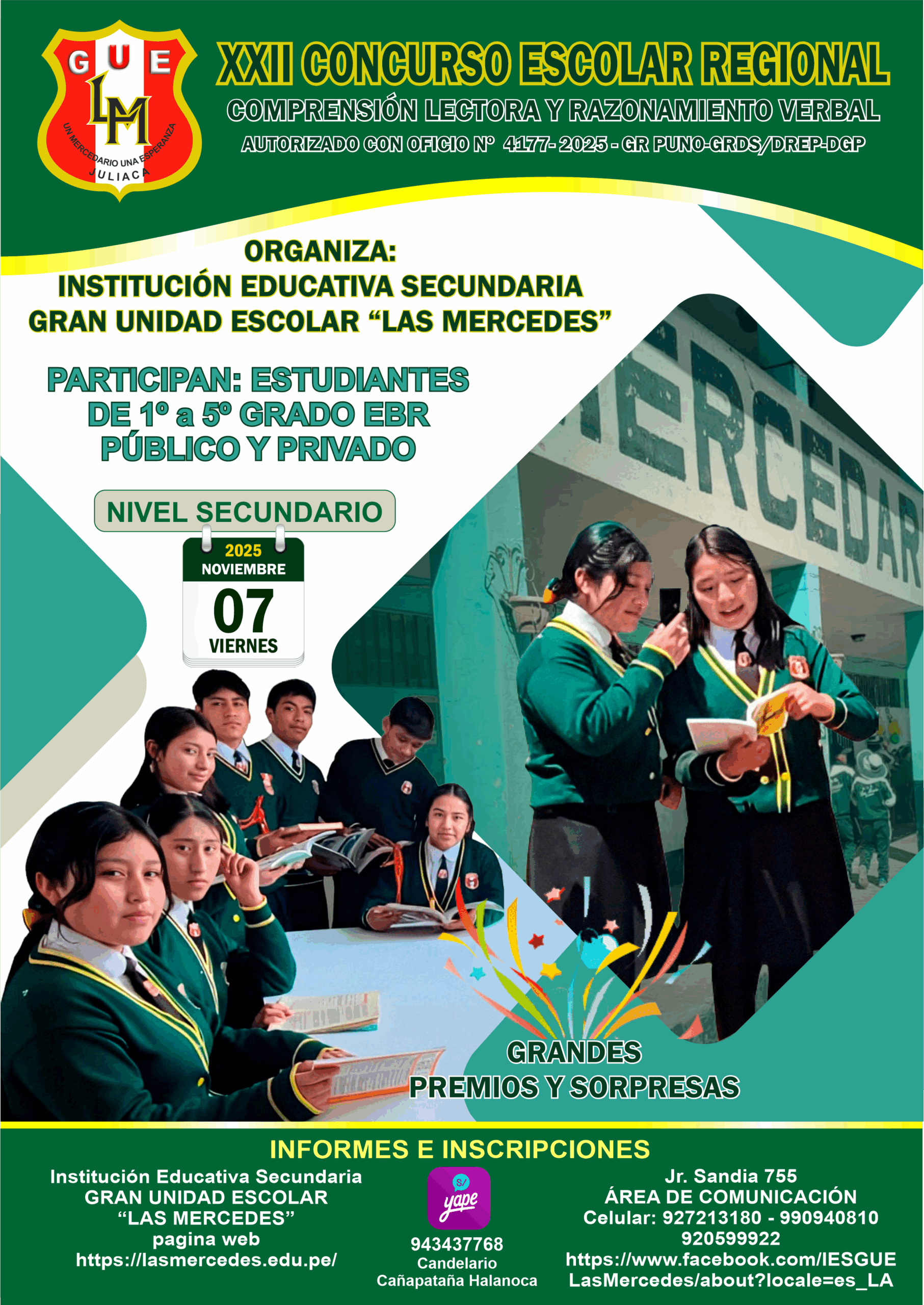 GRAN UNIDAD ESCOLAR LAS MERCEDES «Un Mercedario una Esperanza» HORARIO DE INGRESO Turno MañanaTurno Tarde XXII CONCURSO ESCOLAR REGIONAL DE COMPRENSIÓN LECTORA Y RAZONAMIENTO VERBAL - 2025 Participan estudiantes de las instituciones publicas y privada de primero a quinto grado de educación secundaria. INFORMES E INSCRIPCIONES BASES DEL XXII CONCURSO ESCOLAR REGIONAL DE COMPRENSIÓN LECTORA Y RAZONAMIENTO VERBAL:https://drive.google.com/.../1E3jI4YkFGL6I1xZHzf.../view...FICHA DE INSCRIPCIÓN:https://drive.google.com/.../14ludQKdzh1lwCtXhR8m.../view...¡INSCRÍBETE AHORA! : https://docs.google.com/.../1FAIpQLSfDhb5sXIk.../viewform... CONTACTOS Página Web: lasmercedes.edu.pe/ Facebook: https://www.facebook.com/IESGUE_LA_MERCEDES/ Celular (Área de Comunicación): 927431310 / 996940810